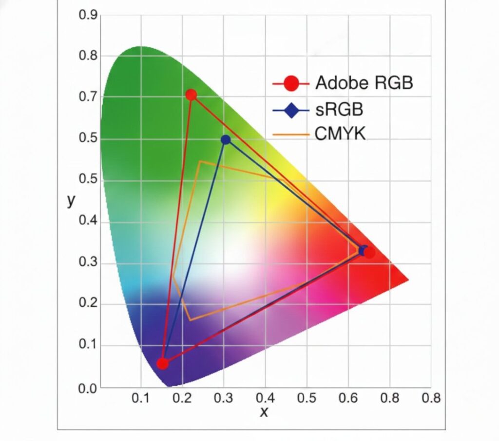 モニターには表示できる色の範囲(色域)があり、sRGBとAdobeRGBという2つの規格が代表的です。「AdobeRGBの方が印刷に向いている」という情報を見て、AdobeRGBでデータを扱おうとする方がいますが、注意が必要です。